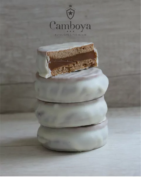 Alfajor cubierto con chocolate blanco relleno con dulce de leche